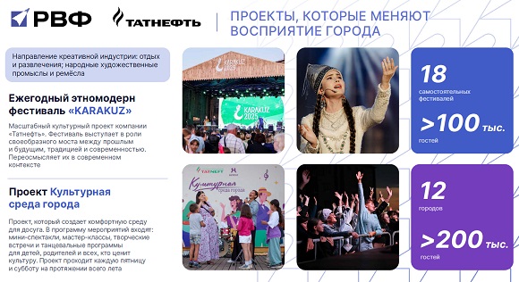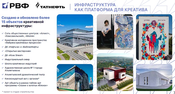Многие годы формируя соответствующую инфраструктуру, «Татнефть» в последнее время перешла к этапу институализации креативной сферы, для чего формируется комплексная система. Создается кадровый акселератор, появляются дополнительные формы образования для людей разных возрастов. Ведется обучение педагогов, в том числе через различные форумы, фестивали.
